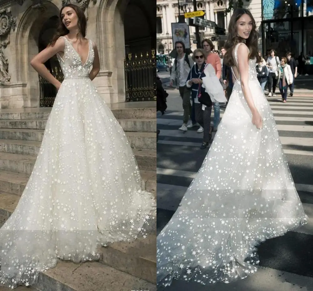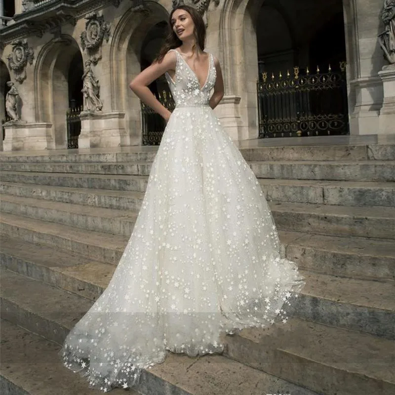 Price Description for New A Line Boho Lace Wedding Dresses V Neck Backless Tulle Beach Wedding Gown Sweep Train Bridal Dress robe de mariee