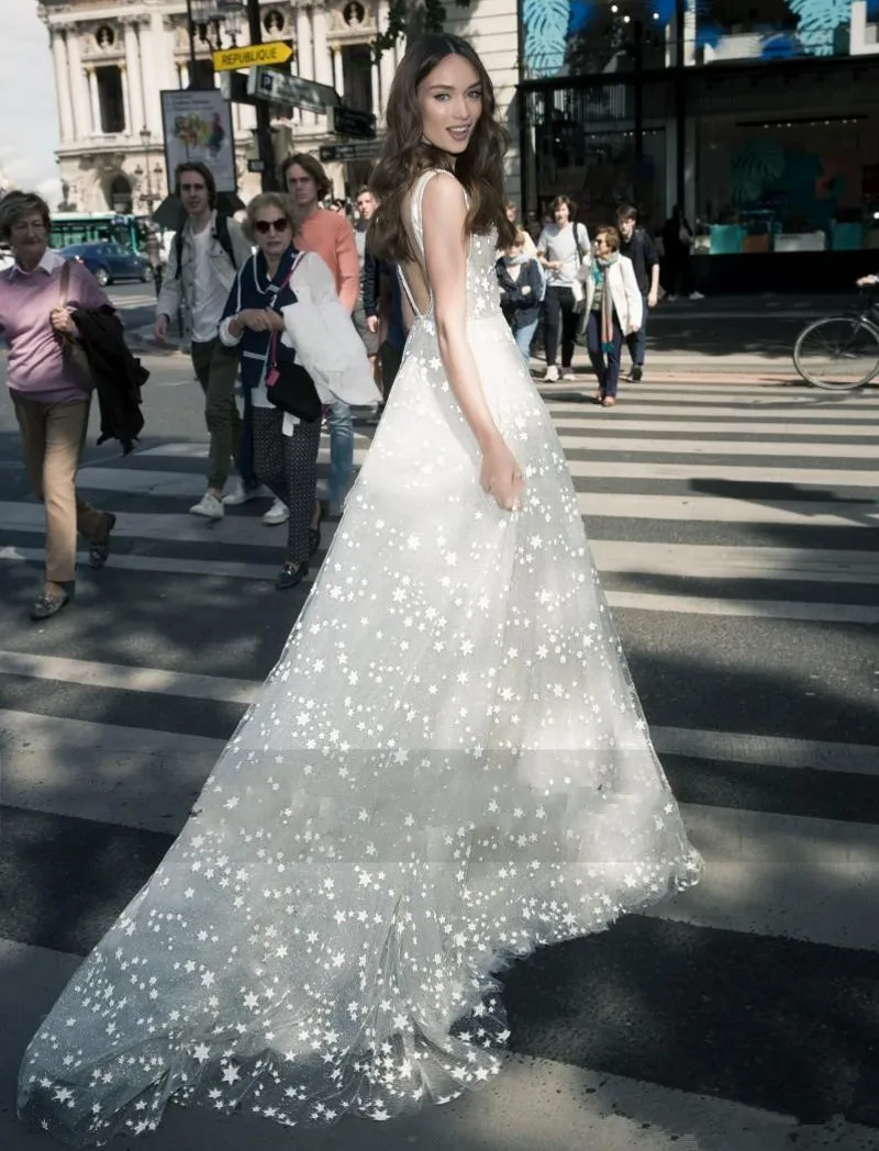 .Gallery for New A Line Boho Lace Wedding Dresses V Neck Backless Tulle Beach Wedding Gown Sweep Train Bridal Dress robe de mariee