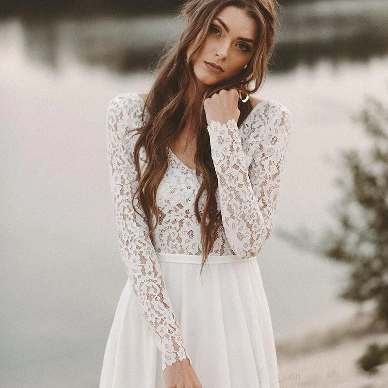 .Images of Cheap Lace Long Sleeves Bohemian Wedding Dress 2020 Elegant V Neck Open Back Chiffon Beach Boho Bridal Gown