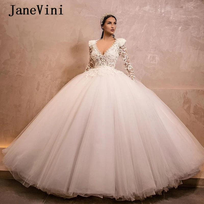 Best Chance for JaneVini Dubai Luxury Beaded Long Sleeve Wedding Dresses with Padded Shoulders V Neck Applique Lace Puffy Ball Gown Bridal Dress