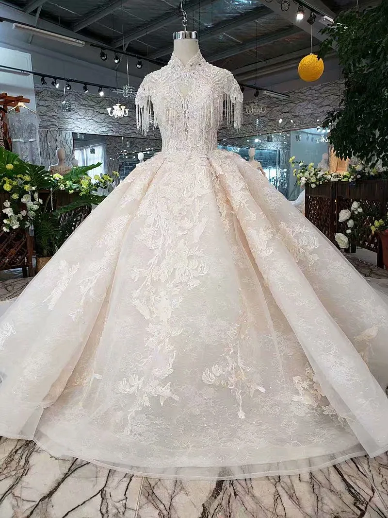 Addition Information of JaneVini Luxury Dubai Champagne Princess Wedding Dresses High Neck Top Crystal Beaded Cape Sleeves Lace Bridal Dress Long Train