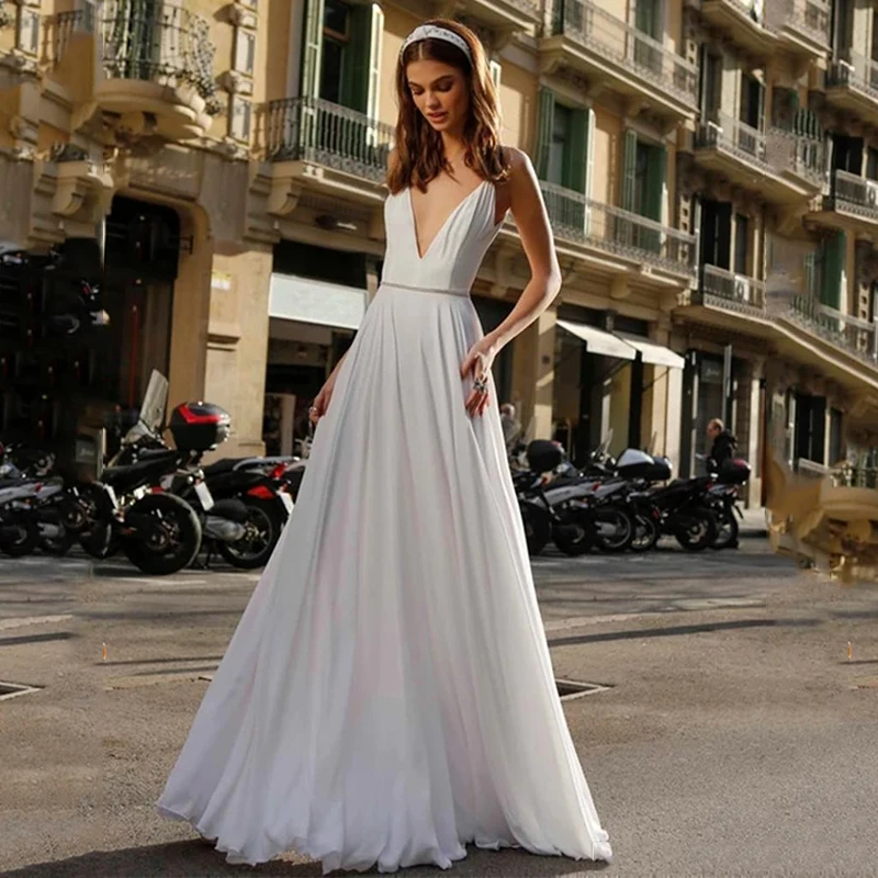 Cheap Offer for Verngo Simple Cheap Beach Chiffon Wedding Dresses V-Neck Spaghetti Straps Bridal Gown Open Back Floor Length Wedding Party Dress